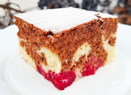 • Prajitura bicolora cu zmeura se lasa sa se raceasca in tava, se decoreaza cu zahar pudra, se taie in bucati.